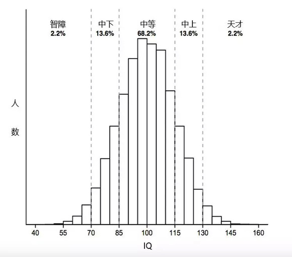 你认识的人中,可能大多数都处在中等水平,只有少数几个聪明绝顶。IQ在130以上的人仅占2.2%。