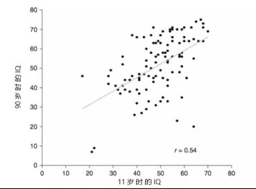 人一生中的智力稳定性。图为同一个人在11岁和90岁时接受的同一份IQ测验的成绩。每个点代表一个人。灰线代表相关度R=0.54。