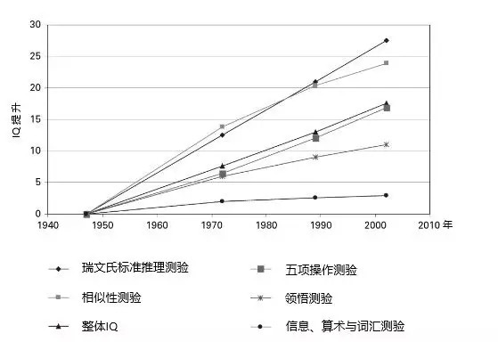 人们的IQ均值似乎每十年都会上升2-3点。这种现象被称为“弗林效应”,它很有可能是儿童营养、医疗与教育改善的结果。(里奇在书中分析称,也有可能是因为我们愈加强调知识是经济发展的引擎,从而鼓励了测验中所涉及的抽象思维IQ的开发。)