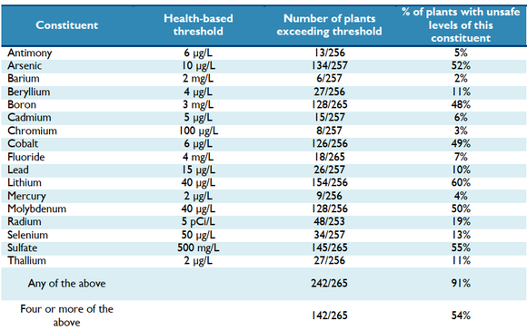 污染最严重的十个煤电厂附近地下水的毒物超标100到500倍不等,它们分布在北卡罗来纳州、怀俄明州、宾夕法尼亚州、田纳西州、犹他州、马里兰州、密西西比州和肯塔基州。