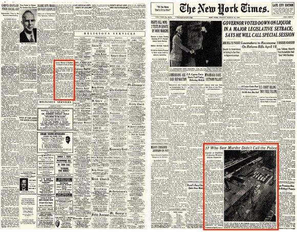 “皇后区一名28岁女性昨日清晨在邱园自家公寓楼前被人刺死。凌晨3点后不久,家住奥斯汀大街70-82号的吉诺维斯小姐发出的叫喊声惊醒了邻居……警方已经着手寻找凶器、询问证人和检查附近车辆,截至昨夜并无线索。”