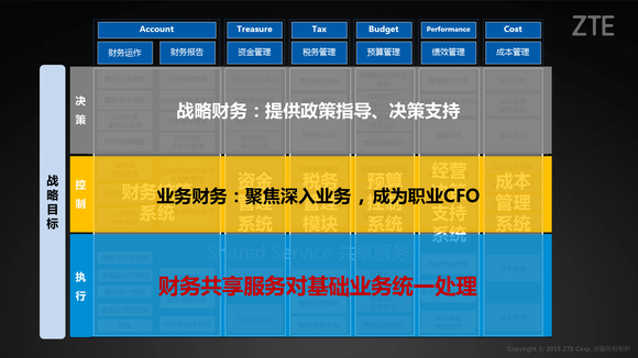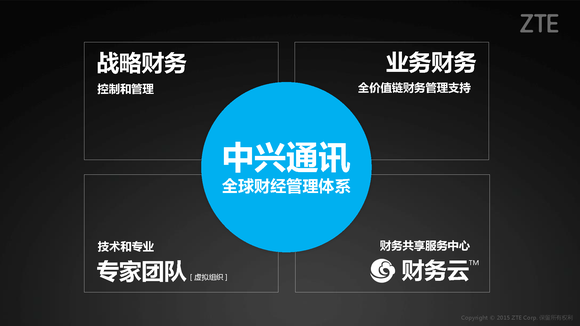 中兴通讯的全球财经管理体系可以总结为“公司层面控制管理、全价值链财务管理支持、财务共享服务、财务核心能力专家团队”的四位一体结构,并落实在共享财务、业务财务、战略财务的三个执行层面,这也是财务共享给中兴通讯财务体系带来的颠覆性变化。