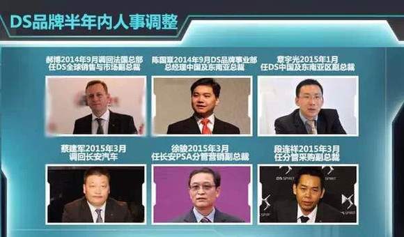 在过去的半年中,长安PSA也出现了涉及6位副总裁以上级别高管的人事调整。2014年9月,DS事业部原总经理赫博调回法国总部:10月,陈国章正式接替赫博,并兼任DS品牌中国及东南亚地区总裁,全面执掌DS品牌中国业务;2015年1月,PSA原亚洲公关与传播总监章宇光被派往长安PSA,担任DS品牌形象中国及东南亚地区副总裁,同期还委任陈育松担任长安PSA网络发展与质量部总监、柯立伟担任DS品牌中国及东南亚地区职能总监,同时重新划分四个销售大区并安排四大区协调人。