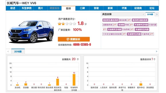 同样的质量问题也出现在长城汽车WEY VV6上,这台新车在车质网上的用户满意度评分仅为1.8分,2018年款车型的故障数为20个,其中有半数出现在车身附件及电器,6个出现在前后桥悬架系统,2个出现在变速箱。车主常见故障主要集中在“新车发动机故障动力突然下降”和“后悬架过减速带时异响严重”。与长城汽车WEY VV5类似,售价更高的VV6在三大件上的表现可谓惨不忍睹。