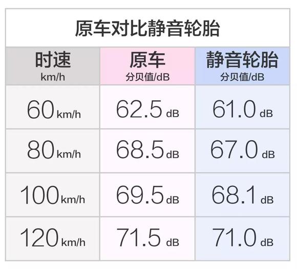 从以上的测试数据中,不难看出,在各种时速下,换胎后都有1-2个分贝的下降,更换静音轮胎确实是对降低车内噪音是有所帮助的尤其是在60km/h和80km/h的时速下效果比较明显,而当超过了100km/h时效果就不那么明显了;不过从整体的效果上来说,对于提升整体舒适性确实是有很大的帮助。