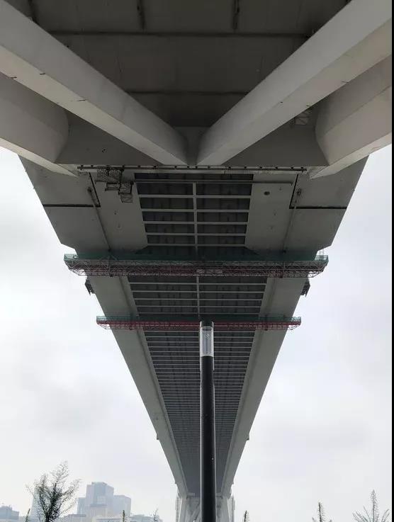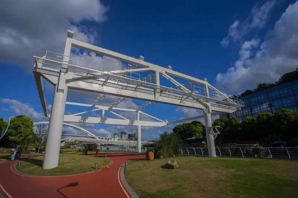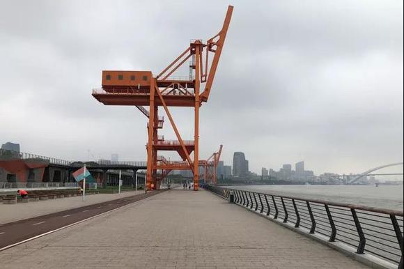 “钻”过卢浦大桥(从桥底下往上瞧的机会也是难得啊),前面就是徐汇滨江道了,路况很好,有专门的步行道和自行车道,这里原来是一个码头,所以还保留着巨大的吊车,沿途有自动售卖机、卫生间、免费寄存处等,还会经过一个带岩壁的运动区域,小朋友肯定要玩上好一会,家长也能歇口气。