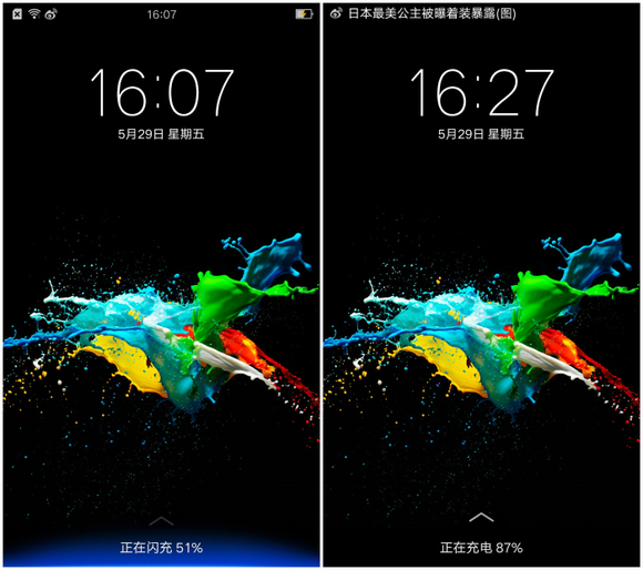 经过我们的实际测试,OPPO R7充电10分钟左右可以增加约30%的电量,20分钟就差不多50%了。对于重度“搞机”者,这个功能还是非常实用的。