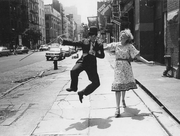 1979年,Rebecca Kelly与舞伴Toni Smith在百老汇街头表演,宣布即将到来的鸽舍表演。