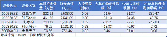 去年四季度,汇金新进了利尔化学(002258.SZ)、双星新材(002585.SZ)、舒泰神(300204.SZ)、科远股份(002380.SZ)、金自天成(600560.SH)等5只个股。这其中,双星新材获汇金新进股数量最高,期间汇金新进该股822.22万股,占流通股比例为0.96%。利尔化学获汇金新进持股461.56万股,占流通股比例为0.88%。