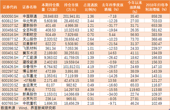 汇金重仓的151只个股中,111家公司2018年归属母公司股东的净利润同比实现增长,占比达74%,这其中,归母净利润同比翻倍的公司达20家。