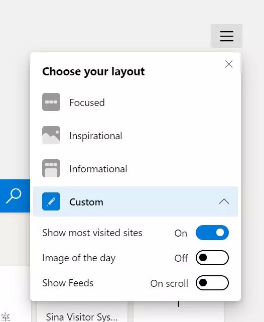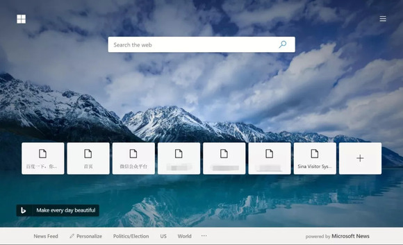 在启动页面可以选择三种不同的风格。除了在现有的Edge已经实现的纯搜索框、常用网址和资讯瀑布流之外,还可以选择加载来自必应(bing)的壁纸。很多网友会下载专门的插件让自己的浏览器首页每天都能加载必应美图,而选择Edge可以自动帮你实现这一愿望。