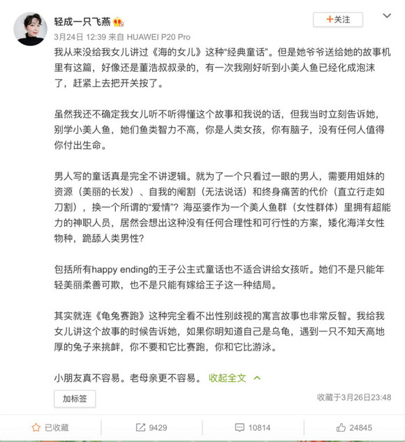 3月24日,微博网友“轻成一只飞燕”表示,自己从来没有给女儿讲过《海的女儿》这种“经典童话”,批评男人(即丹麦作家汉斯·克里斯蒂安·安徒生)写的童话毫无逻辑可言:“就为了一个只看过一眼的男人,需要用姐妹的资源(美丽的长发)、自我的阉割(无法说话)和终身痛苦的代价(直立行走如刀割),换一个所谓的爱情……矮化海洋女性物种,跪舔人类男性。”她的结论是,所有有着幸福快乐结局的王子公主式童话都不适合讲给女孩听,因为女孩不能只是“年轻美丽柔善可欺”,嫁人亦非女孩人生的唯一选择。