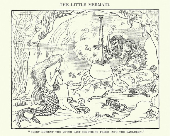“但是我也必须得到报酬,而且我要的不是无所谓的东西。你有胜过海底任何一个的最甜美的嗓子,而且你自信能用它迷住王子,你却必须把这嗓子给我;我要你所拥有的最好东西作为我给你的药的代价。”