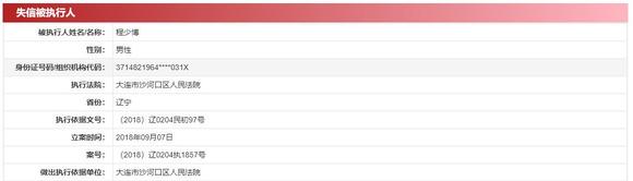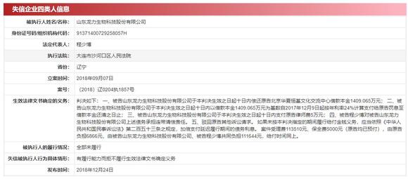如,2016年底,*ST龙力曾向北京华夏恒基文化交流中心借款1600万。该款项由程少博提供担保,到期以后一直未足额偿还。2018年8月15日,辽宁省大连市中级人民法院判决,*ST龙力应在10日之内偿还本金。由于未履行判决,*ST龙力及其法人代表程少博,被大连市沙河口区人民法院列为失信被执行人,即俗称的“老赖”。