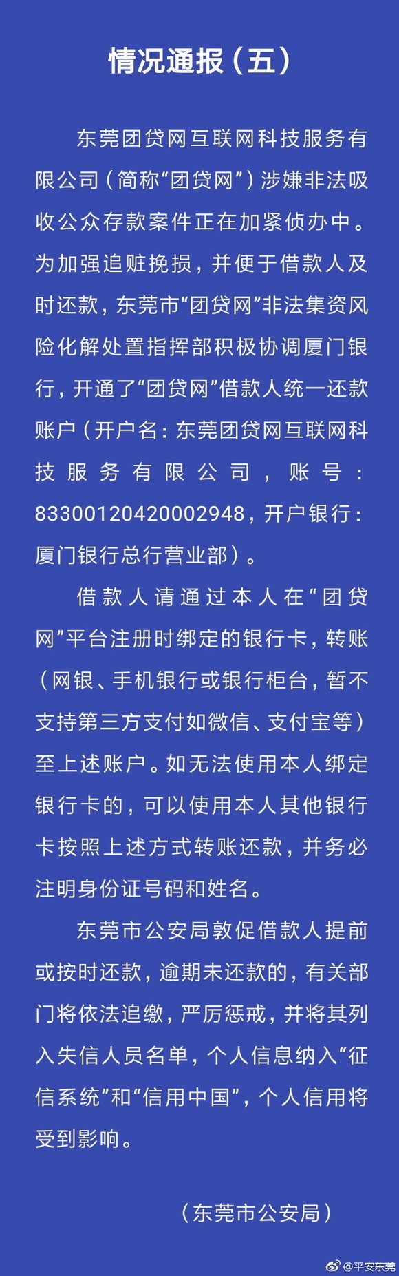 通报称,“团贷网”涉嫌非法吸收公共存款案件正在加紧侦办中。为加强追赃挽损,并便于借款人及时还款,东莞市“团贷网”非法集资风险化解处置指挥部协调厦门银行,开通了“团贷网”借款人统一还款账户(开户名:东莞团贷网互联网科技服务有限公司,账号:83300120420002948,开户银行:厦门银行总行营业部)。