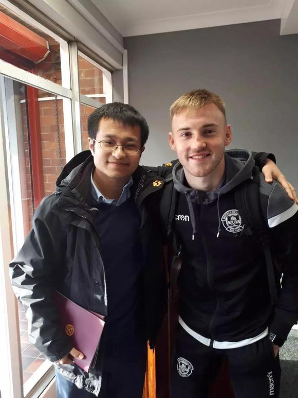 惊喜到了这个份上,居然还没有结束。经过了上半场的闷平,球队在70分钟以后连进三球,取得了比赛的胜利。赛后,我受邀观摩本场最佳球员的颁奖仪式,而一位球迷组织的董事大姐,则专门安排球队的一位核心球员与我合影。原因是,我在赛前一天的采访中被问到喜欢球队哪名球员,当时我就说了队里一名叫Allan Campbell的苏格兰U21国脚,没曾想今日就得以如愿。
