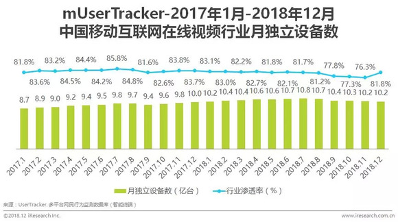 艾瑞咨询研究数据显示,在线视频行业自2017年12月达10亿台的月独立设备数规模后,月独立设备数在10亿台至11亿台间波动,行业渗透率维持在80%左右,用户规模趋于稳定。在视频行业的下半场,细化视频内容,提高节目质量成为稳固老用户抢夺新用户的重点。