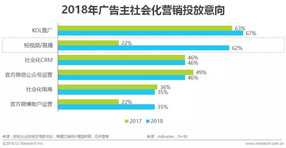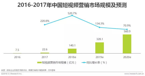 短视频的崛起使长短视频呈现此消彼长的关系。随着短视频营销价值凸显,短视频营销的变现模式逐渐受到认可。2018年短视频营销迎来快速发展期,市场规模达到140.1亿元,同比增长高达520.7%。广告主预算的逐渐倾斜,内容方、MCN和营销服务商不断推动短视频营销能力的专业化,都是推动短视频营销市场规模增长的主要原因。