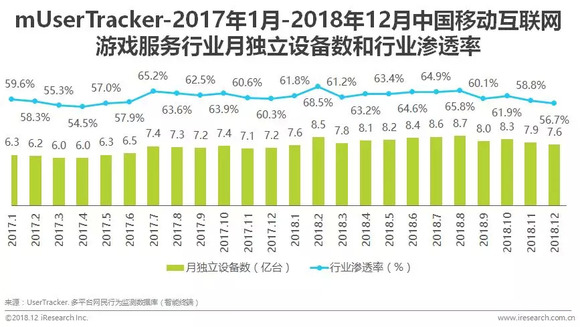 自2018年3月以来,受游戏版号审批暂停影响,游戏服务行业普遍进入产品荒、用户荒的困境。游戏发展中的必须要面对的“青少年心理健康”社会舆论压力和政策监管成为行业规模增长的重大阻力之一。从艾瑞第三方移动网民行为监测产品mUserTracker数据上来看,在2018年前半年月独立设备数震荡增长,8月后月独立设备数出现下降趋势,但整体而言2018年游戏服务用户规模仍要大于2017年。游戏内容作为政策严监管的主要方向之一,合规运营、且拥有优质产品研发能力的公司将获得更大的市场空间。从用户角度出发,未来中国游戏赛道快节奏的射击游戏及休闲娱乐游戏将成为流量及用户注意力的主要增长点。