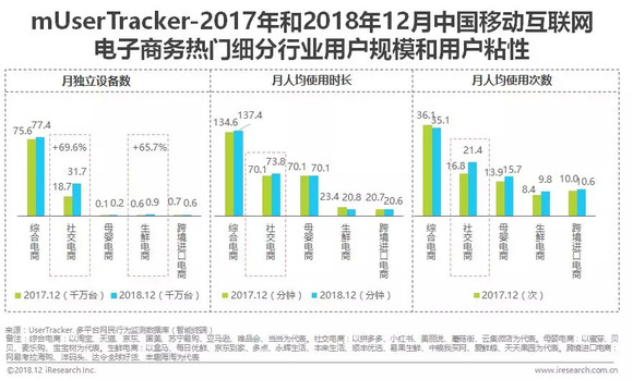 2018年是社交电商集中爆发成长的一年,无论是以拼多多为典型的拼团购物形式,还是以小红书为代表的种草社区购物形式,都在2018年大火,促成了社交电商的总体攀升。社交电商月独立设备数从2017年12月的1.87亿台倍增至2018年12月的3.17亿台,拼多多也在这一年上市,同时,社交电商对用户注意力的争夺也较其他电商更亮眼。