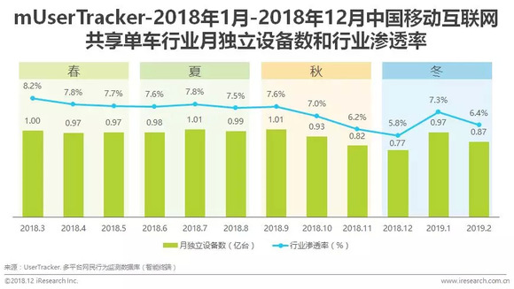 尽管2018年整个共享单车赛道跌落神坛,但从整体行业发展的角度来看,“共享经济”代表着我们对互联网商业模式创新的思考。共享单车行业的独立设备数呈现出春夏高于秋冬的特点。从冬季转春季时,用户数明显上涨,从夏天转为秋天的过程中,骤然下滑。除了季节性规律外,10月份的下滑受ofo小黄车的影响也较大。2018年的冬天,OFO的押金风波还历历在目,时至今日,距离共享经济春天的到来似乎依旧遥远。