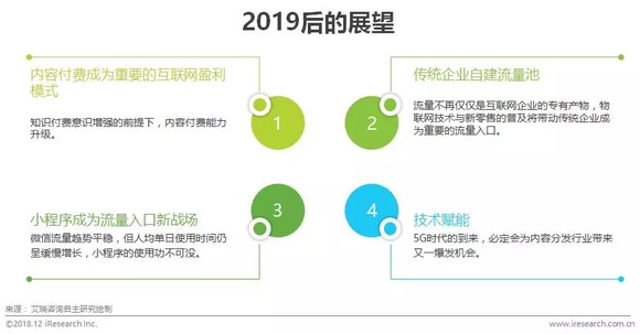 经历过2018年巨大的流量环境变化,在中国互联网红利稳定饱和的漫长的未来,我们仍然需要对“增长”与“发展”上下求索。未来几个流量变化的因素值得我们关注:1)2019年后整个内容付费会成为互联网重要的模式,并且这种趋势一定会越来越强化,以长视频为例,2019年爱奇艺会员收入有可能和广告收入持平,甚至超过广告收入; 2)流量已经不是互联网企业的专有名词,在未来,例如房地产、金融、教育、零售,物联网技术与新零售的普及将带动传统企业成为重要的流量入口;3)小程序将成为非常重要的流量入口;4)5G时代的到来,必定会为内容分发行业带来又一爆发机会。