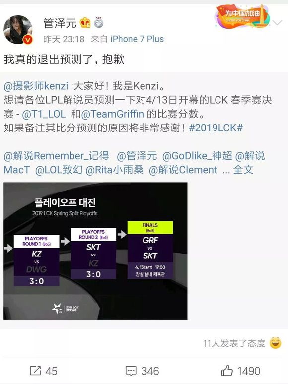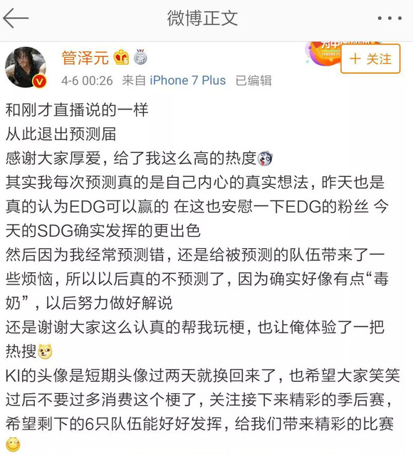 4月5日,LPL春季赛季后赛第二场,EDG对阵SDG。赛前,LPL官方解说管泽元在直播时发表了对这场比赛的个人预测,并在微博发文,非常坚定地表示,自己的预测不会错。