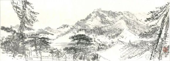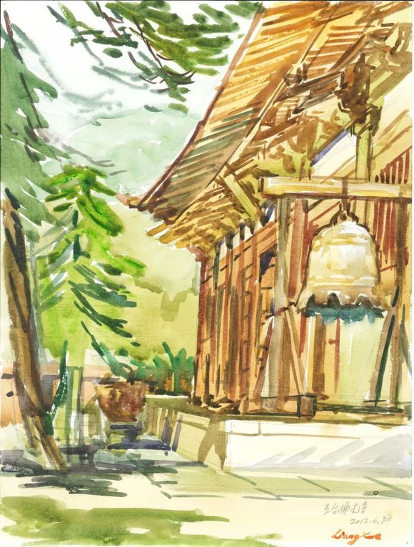 面对千年古寺,我曾在东大殿的东南角画过水彩写生一幅。第二次去又在东大殿的前檐下绘西山远眺手卷一幅,并作七言题画诗一首以记行旅: