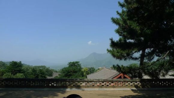 高处平台上的景观与“西山远眺” 要从第二个院子到达东大殿所在的平台需要经过一段相对狭窄、幽闭的甬道,爬上一段斜度在四十五度左右的直跑楼梯。当上行到直跑楼梯一半的时候,可以看到楼梯左右两侧的环境,特别是北侧建筑的跌落式屋顶,以及围合建筑群的树木、远山。抵达高处的平台后,空间变得清幽和深邃。也许与八十年前甚至更早的景观类似,这里除了建于唐代的木构建筑、唐代的经幢以及散落在廊下的石碑外,就是两棵健硕的古松。