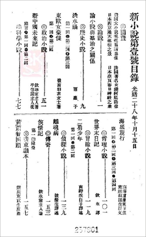 梁启超在创刊于1902年的杂志《新小说》第一期中推出“科学小说”一栏,连载卢藉东和红溪生转译自日语的儒勒·凡尔纳小说《海底旅行》。然而,如果按照现在的标准,同期梁启超本人撰写的《新中国未来记》和他所翻译的《世界末日记》,也应当划分在科幻小说的范畴内。前者畅想未来中国君主立宪的盛世,是典型构想未来的乌托邦小说;后者则聚焦末世,“以科学上最精确之学理,与哲学上最高尚之思想”,传达梁启超“一切皆死,而独有不死者存”的颇具社会达尔文主义的哲学理念。