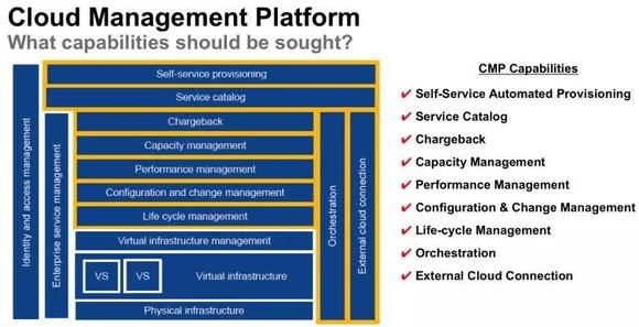 CMP主要能力包含自服务、提供系统映像、计量计费以及通过既定策略优化工作负载。更先进的产品还可以与外部企业管理系统集成,包括服务目录,支持存储和网络资源的配置,允许通过服务治理加强资源管理,并提供高级监控,提高性能和可用性。