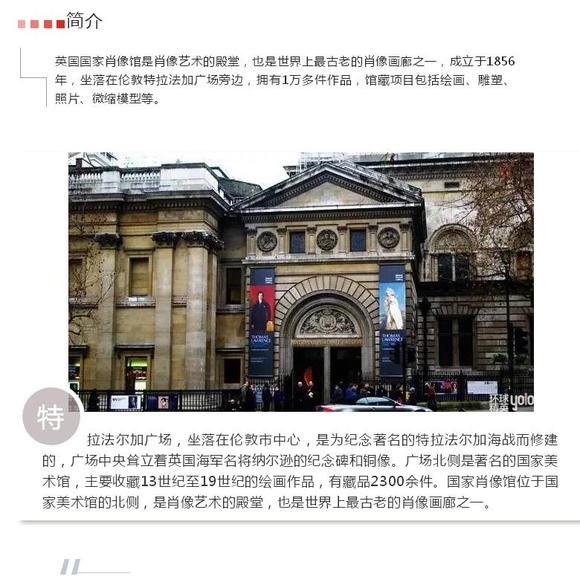 1856年,在维多利亚女王的恩准下,英国下院通过提案,成了国家肖像馆,在当时,这是世界上第一个肖像美术馆。于1896年迁入现在所在的馆址,和国家美术馆成了邻居。此馆专注于收藏重要历史人物肖像相关的绘画、照片、素描、雕塑等作品,后来其肖像收集范围又扩展到普通人群,如今拥有21万件藏品。