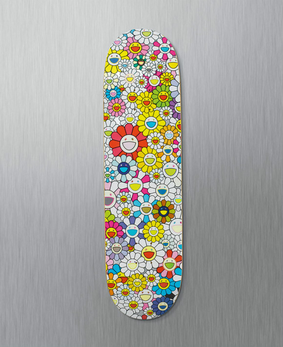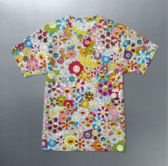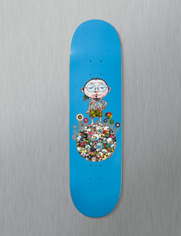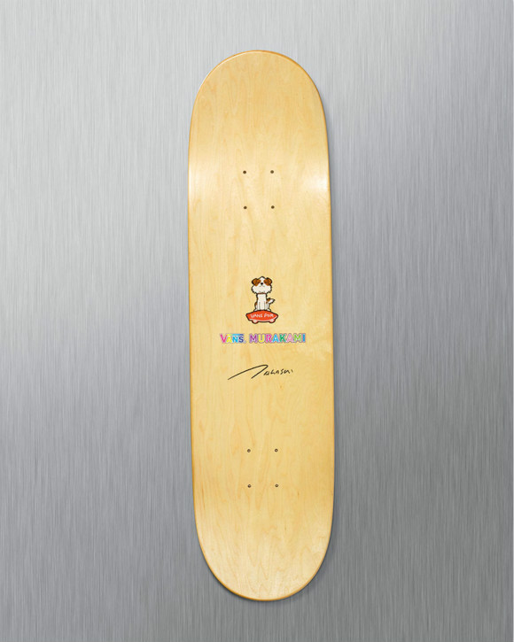 除了鞋,新印花还将席卷滑板和T恤。其中T恤分为三款:一款大花、一款骷髅还一款村上隆本人的动漫肖像。前两款同样印有Pom坐在滑板上,单价80美元,约合人民币500人民币,而人像款竟然比狗款便宜,即使看起来整只Pom还不如村上隆的头大,动漫版艺术家也只卖78美元(约合人民币480美元)。