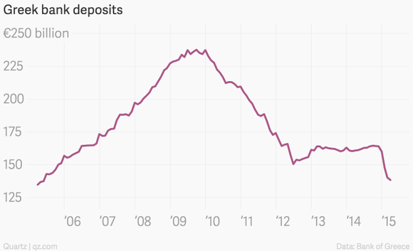 让我们来看看第二张图表,它很好地展现了希腊银行的存款水平。由于人们担心希腊退出欧元区,他们所持有的欧元将因此变成贬值的德拉克马(drachma 希腊使用欧元前的货币单位),挤兑在最近几月出现高峰。随着时间的推移,希腊政府与其债权人之间的博弈也再次显示出希腊的命运将在很大程度上取决于双方能否讨论出一个最终可行的方案。