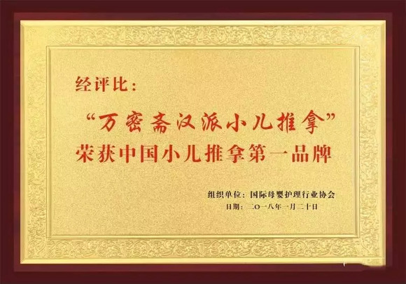 别看湖北研妆实业创办的母婴培训学校问题重重,但晓婴坊力推的“万密斋汉派小儿推拿”却在2018年1月20日,被国际母婴护理行业协会评为“中国小儿推拿第一品牌”。