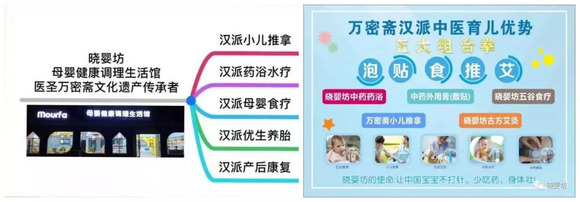 另外,湖北研妆实业推出的晓婴坊母婴健康调理生活馆,囊括了“汉派”健康全系列服务项目,包括汉派小儿推拿、汉派药浴水疗、汉派母婴食疗、汉派优生养胎、汉派产后康复。除此之外,晓婴坊还借助“中医育儿”的名头,打出了“泡、贴、食、推、艾”五大组合拳。