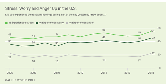 但对美国人民来说,过去的一年对他们的心理形成了很大挑战。盖洛普调查显示,在2018年有55%的美国人表示,他们在一天中的大部分时间里感到压力,45%的美国人表示担心,22%的美国人表示愤怒。从时间曲线来看,这三项主要负面情绪在2017年左右开始上升,到2018年中期分别上升了5个百分点,大于2008年金融危机期间负面情绪的上升幅度。