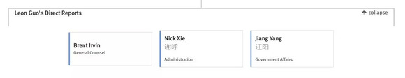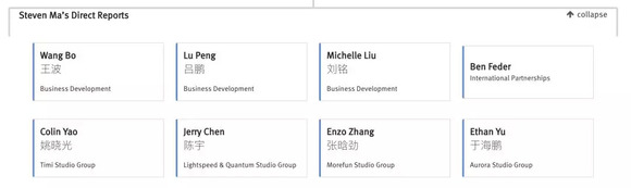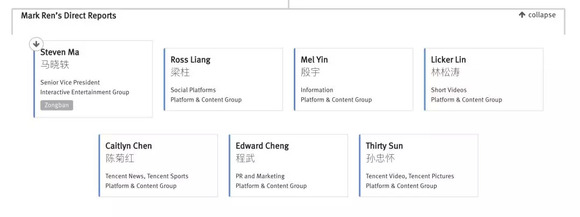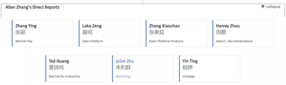 此外,曾鸣(开放平台)、张孝超(基础平台产品)、周颢(搜索、推荐)、黄铁鸣(企业微信)、朱利群(市场)和殷婷(战略)也向张小龙直接汇报。