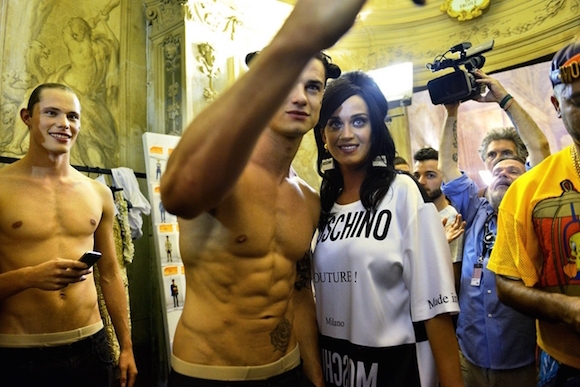 意大利,弗洛伦萨——“他的风趣时尚界无人能及。”水果姐 Katy Perry 在周四的 Moschino 时装秀的后台说道,这场秀在注著名的科西尼宫里画着壁画的沙龙里举行,她说的是她的老朋友——设计师 Jeremy Scott 。
