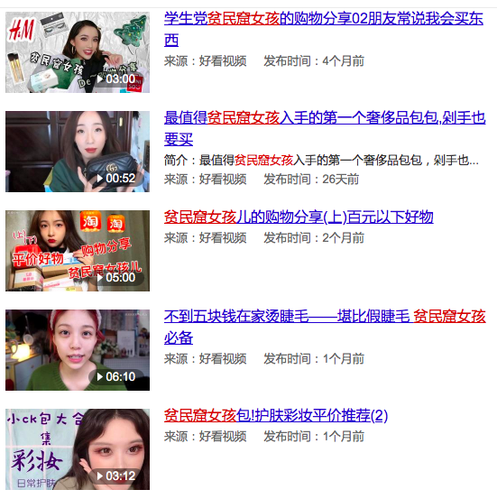 最近两三年,“贫民窟女孩”成为一个网络流行语:在买不起一些化妆品、服装、偶像演唱会门票或其他想要的东西,或者单纯觉得自己没钱消费时,她们常常发出感叹,自嘲为“贫民窟女孩”;一些微博博主和视频up主们也打着“贫民窟女孩也用得起”的旗号推荐各类平价护肤品和生活用品。显而易见的是,这里的“贫民窟”不指代某个真实的贫民窟,也不一定意味着真正匮乏的物质生活,而仅仅是一个化约为“穷”的自嘲之语。所以,虽然“贫民窟女孩”(以及“贫民窟男孩”)这类语汇被广泛使用,但它与现实存在的真正意义上的贫民窟毫无关联,甚至没人会因此联想到乃至去谈论真实贫民窟中的女孩男孩们。