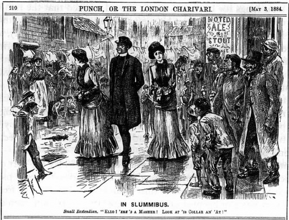 这样的贫民窟同时也激发了一些伦敦上流阶级的“肮脏”幻想。对于富人来说,东岸既是一个道德堕落、藏污纳垢的危险地带,也是一片容许猎奇和性冒险的飞地。许多社会改革家抨击这种动机不纯的贫民区游历者,但依旧不妨碍一些人以慈善和道义的名目展开贫民区冒险。到了十九世纪后期,贫民区游历已经发展成了伦敦上流社会一种不问目的的休闲活动。