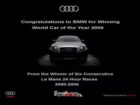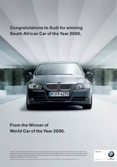 2006年,宝马发布了一张平面广告,文案为:“恭喜奥迪荣获南非2006年最佳轿车称号 —— 来自2006年全球最佳轿车品牌宝马”。