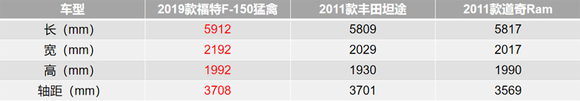 猛禽车身尺寸最大,坦途和道奇Ram不相上下
