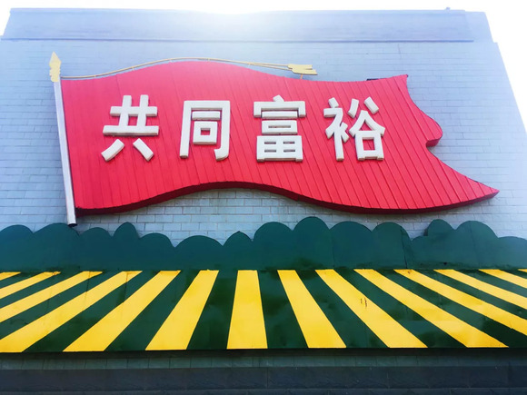 村里随处都能看到“共同富裕”的标语,摩登洋气的咖啡店取了个“共同富裕”的名字;数米高的腾飞塔印着“贾家庄”三个大字,塔顶是一匹正在奔腾的骏马,近百米远的巨型水塔上刻着“翻身不忘共产党”。村史展览馆还打造了一塑毛主席的金身,“不当百万富翁,要建亿万富村”的口号成为全村人的共同信仰。