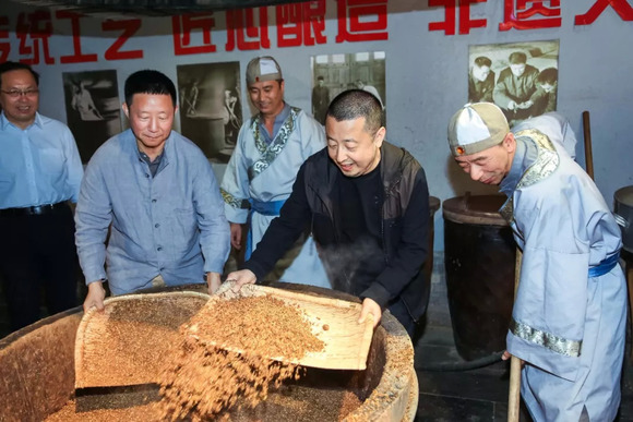 汾酒集团位于贾家庄隔壁的杏花村,中巴行驶约20分钟,一路上能看到的店铺几乎全是白酒直销、以及为全国各地洽谈业务的商人们所配套的商务会所、酒楼等。进入汾酒集团大院,道路两旁枝叶硕大的法国梧桐为我们筑起阴凉。在集团工作人员的指引下,贾樟柯和欧阳江河拿着铁锹铲起了酒糠,学习其中的白酒制作工艺。在当天“汾酒行”的晚宴上,贾樟柯在台上吟诵了多首以酒为主题的诗句,并表达了对汾酒集团的感谢。