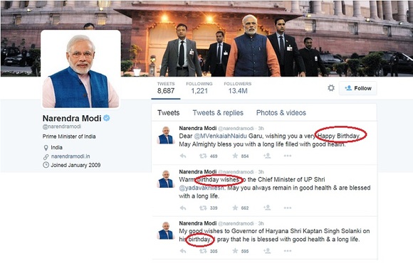 莫迪的团队不光牢记外国领导人的生日,本国官员也受到类似的礼遇。同样在7月1日这一天,他的Twitter账号还同时向国内三名官员送出生日祝福。↓