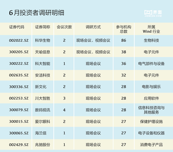 界面新闻统计了今年6月份机构参与调研次数最多的企业。6月股市暴跌让投资者再次回归理性,机构们实地调研也表现出一定的谨慎。相较于上个月有600多家企业被调研,6月份被调研的企业总数下降为405家。从行业类型上来看,工业机械业表现出强势劲头最受调研机构的青睐,占被调研企业总数的10.9%。电气部件与设备业、电子元件业也频受机构关注,分占5.9%和4.9%。在众多被调研的上市公司中,科华生物(002022.SZ)、天喻信息(300205.SZ)、科大智能(300222.SZ)等最为热门。