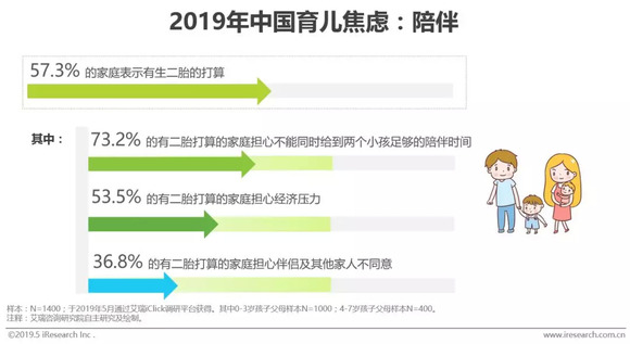 全面放开二胎政策的落地,拓宽了独生子女家庭生育的选择空间。随着二胎政策正向效应的逐渐释放,独生子女家庭的生育意愿开始改变,艾瑞的一项用户调研显示,有超过半数的受访者表示有生育二胎的打算。但是养育二孩给家庭提出了诸多挑战,除了高昂的育儿成本带来的经济压力以及家人的态度外,无法同时给予两个孩子充分的陪伴成为了众多家庭在准备二胎过程中的核心焦虑点。考虑到二孩家庭1+1>2的烦恼和幸福,很多家庭在是否要二胎上犹豫不定。