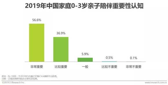 根据调研结果显示,56.6%的0-3岁孩子父母认为亲子陪伴非常重要,36.9%的父母认为比较重要。一定程度上可以看出,就目前亲子陪伴的现状而言,大多数父母比较看重亲子陪伴并愿意付出时间精力陪伴孩子,但其重要性程度并没有传播到全部父母群体中。因此,亲子陪伴的概念和方式的传播与普及仍需付出较大努力。
