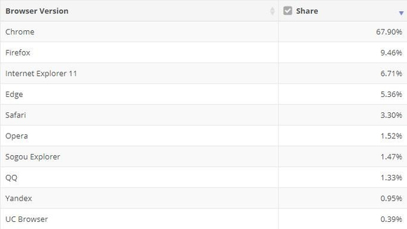 在Netmarketshare公布的这份数据报告中,作为PC操作系统霸主的微软却显得非常暗淡,比如,尽管Internet Explorer市占率排名第三,但份额仅有7.70%,即便是跟微软自家的Edge加起来(以5.36%的市占率位居第四),其总市场份额还不到谷歌15%,令人嘘嘘!